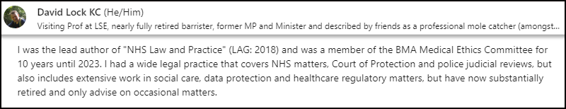 David ‘he/him’ Lock KC is one of the lawyers involved in the current legal challenge to the government’s ban on puberty blockers. He also advised former Mermaid’s boss, Susie Green, on the setting up of a new gender clinic which is intended to dodge the puberty blocker ban. Until last year he was a member of the BMA Ethics Committee, a position he held for an entire decade.