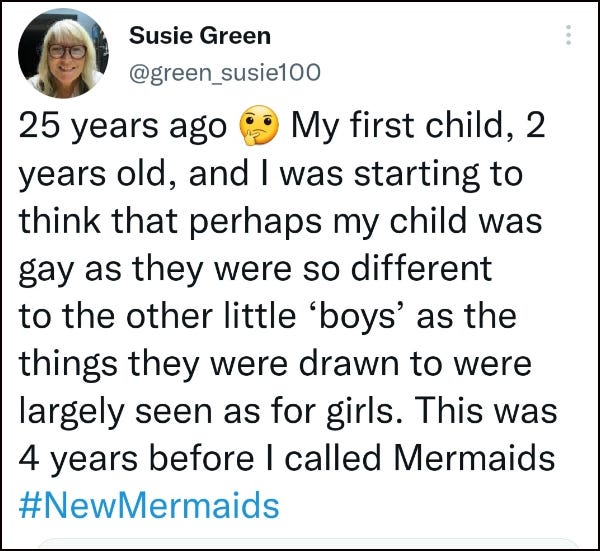 We have reported on Susie Green in the past. She was the Chair of disgraced charity, Mermaids, from 2011 until 2015 and then the CEO of Mermaids from 2016 until her sudden departure in November 2022. She famously took her young son to Thailand to undergo so-called ‘sex reassignment surgery’ on his sixteenth birthday, circumventing the age limit of 18 for such surgeries dictated by UK law. She would later give a TED Talk in which she openly admitted that having a feminine little boy who liked playing with ‘girls’ toys’ made her husband extremely uncomfortable.