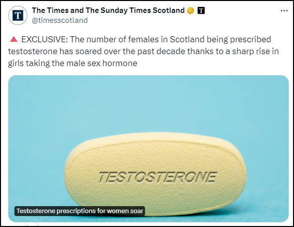 THE TIMES: The number of trans-identified young women in Scotland who are taking testosterone has increased almost fifty-fold over the last decade.