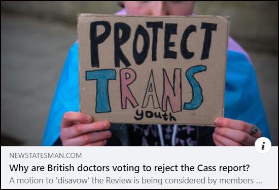 Thanks as ever JL. These updates normally make me feel sick and angry. This one is completely chilling. The fact that the C of E, the BMA, lawmakers in California etc are all captured to the point that they are prepared to ignore the mass of evidence which is building up against gender ideology and are happy to put children on the medical gravy train without a moments doubt. These organisations are just the tip of the iceberg, many more, if not most are captured. The task ahead is huge and I can only think that we need something huge to happen, to wake people up from the trance so many appear to be in.