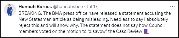 Following the publication of Hannah Barnes’ article in The New Statesman, the BMA’s press office released a statement claiming that it was ‘misleading’, an allegation Barnes refutes. The statement did not reveal the result of the BMA Council vote on whether or not to ‘publicly disavow’ the Cass Report.