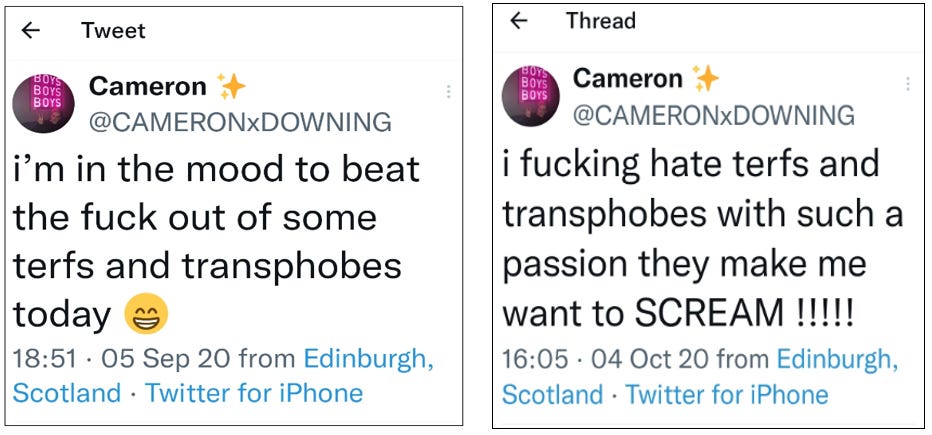 The now-deleted comments dated from September and October 2020. In one of the tweets, Downing stated, “I’m in the mood to beat the fuck out of some terfs and transphobes today”. In another, he declared, “I fucking hate terfs and transphobes with such a passion they make me want to SCREAM !!!!!”