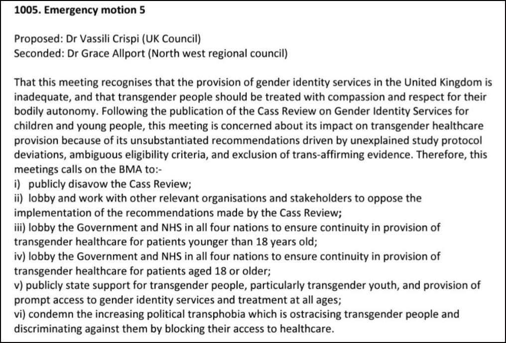 This week Hannah Barnes reported that BMA Council members intended an imminent vote on whether or not to ‘publicly disavow’ the Cass Report. Furthermore, the motion calls on doctors to “Lobby and work with other relevant organisations and stakeholders to oppose the implementation of the recommendations made by the Cass Review” and to “Lobby the government and NHS in all four nations to ensure continuity in provision of transgender health care for patients younger than 18 years old”.