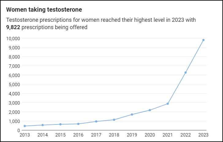 NHS figures show that the number of young women in their twenties who take testosterone rose dramatically from just 47 in 2013 to 2,194 in 2023. For girls under 19, prescriptions have rocketed from just 20 in 2013 to 484 in 2023.
