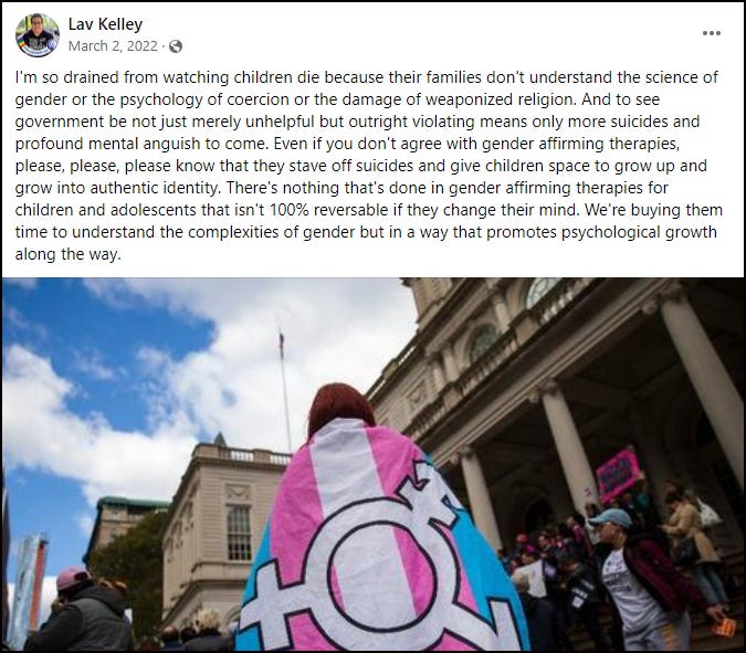 In June 2023, at which time, according to the case, the Doe’s son was living with her, Lavender Kelley posted a photograph to her Facebook page. In this photograph, she is posing with the US Assistant Health Secretary, Rachel Levine a trans-identified male and vociferous advocate for the medicalisation of gender confused children.