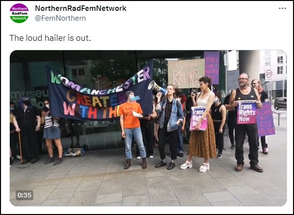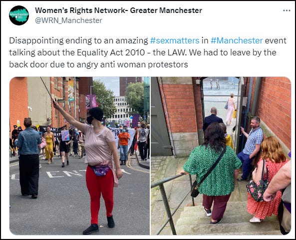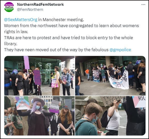 Of course, trans activists couldn’t allow women a few hours in which to discuss and learn about their legal rights. With tedious inevitability, they turned out to try and disrupt the event and intimidate those in attendance.