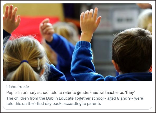 THE IRISH MIRROR: Children at a Dublin primary school are being instructed they have to use ‘gender neutral’ pronouns for their female teacher.