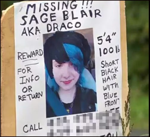 Sage was very badly bullied at her new school. According to Michele Blair’s law suit, this bullying involved both verbal and physical assaults and a barrage of rape threats from male pupils. Despite such threats, it seems that Sage was still encouraged to use the boys’ toilet facilities at school. Eventually, apparently because of the bullying she was suffering, Sage ran away from home.