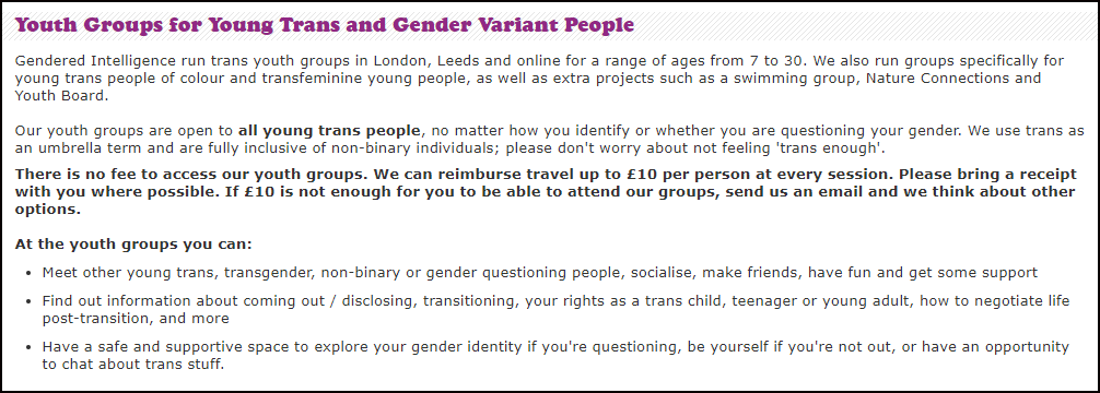 Gendered Intelligence is a registered charity that “Works to increase understandings of gender diversity and improve the lives of trans people”. Much of its work focuses on children and adolescents and it runs workshops for ‘trans kids’ as young as seven.