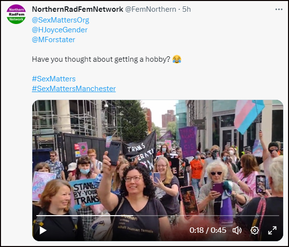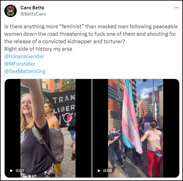 Trans activists (with obviously male voices) can be heard shouting “Fuck Helen Joyce” as they trailed behind her along the pavement. They can also be heard chanting “Free Sarah Jane” ie Sarah Jane (formerly Alan) Baker, the trans-identified male convicted of torture and attempted murder who called for women to be punched in the face.