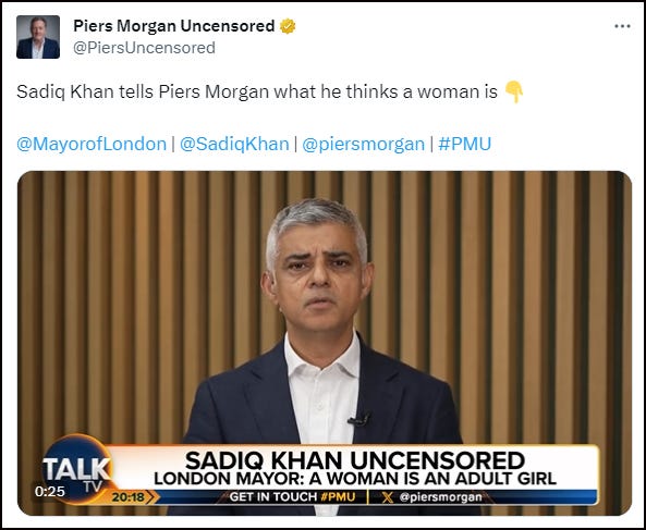 Speaking to Piers Morgan on Talk TV, Sadiq Khan was asked what a woman is. He responded: “I answer that question knowing full well that people are going to be watching this who may have gender dysphoria and may have concerns in relation to this issue… A woman, when it comes to biology and sex, is an adult girl. But there are some women who may have gender dysphoria and trans women can also be women as well.”