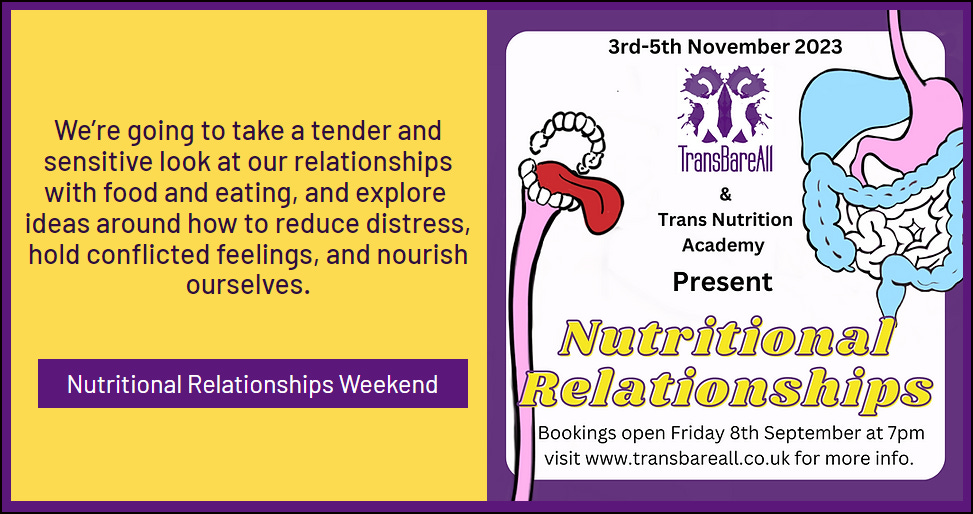 Reduxx reports that TransBareAll now appears to be targeting trans-identified women with eating disorders. One of the residential weekend events being held in November is called ‘Nutritional Relationships’ and described as an opportunity for participants to “Take a tender and sensitive look at our relationships with food and eating.” Again, this weekend is mixed sex - “Open to anyone who self-identifies as being on the trans spectrum or is questioning their gender” - and, again, “The accommodation consists of dorm type rooms of various sizes”.