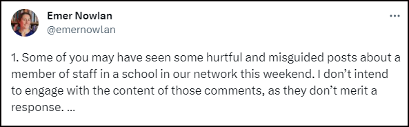 Psychotherapist and best-selling author, Stella O'Malley, commented: “Insisting on children using 'they/them' pronouns is in breach of the HSE's Children First guidelines… The concept of being non-binary is complex. Some children will be fine with it, some uncomfortable, some will not accept this rule and some will believe they are being asked to lie. Other children will have religious beliefs that prevent them from viewing this teacher as they/them (or non-binary). Children with additional needs could be confused and distressed”.