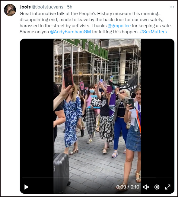 After the event, trans activists harassed attendees in the street and stalked Helen Joyce, Emma Hilton and Maya Forstater, dogging their heels and shouting abuse.