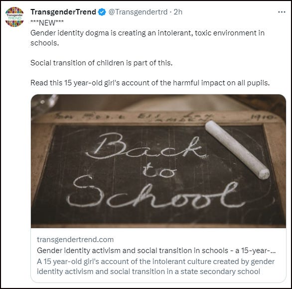 It has been delivering training in schools, including primary schools, telling kids they can change their names and pronouns ‘at any time’, since 2008. As Transgender Trend says, “In itself, confusing young children about biological sex and eroding boundaries between the sexes through pretending that sex is not real, should be something that rings alarm bells for anyone concerned with safeguarding and child protection”.