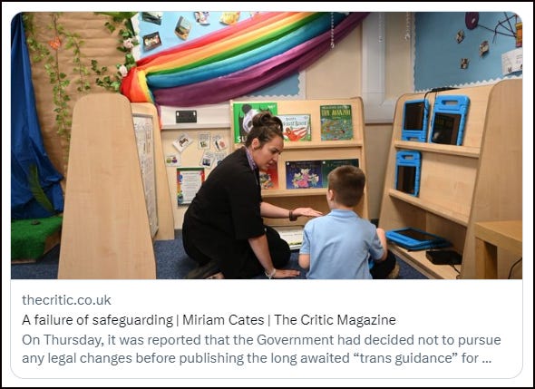 Earlier this week The Telegraph reported on hearsay that the promised and long-awaited government transgender guidance for schools could be shelved. However, writing in The Critic, Conservative MP, Miriam Cates, scotched this rumour as categorically untrue. Nevertheless, she did add that “The urgent need for this guidance cannot be overstated”.