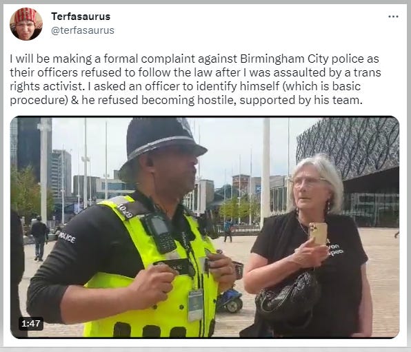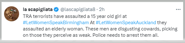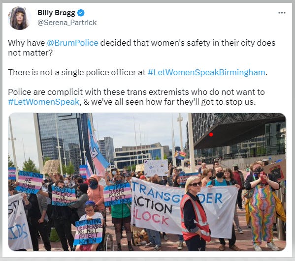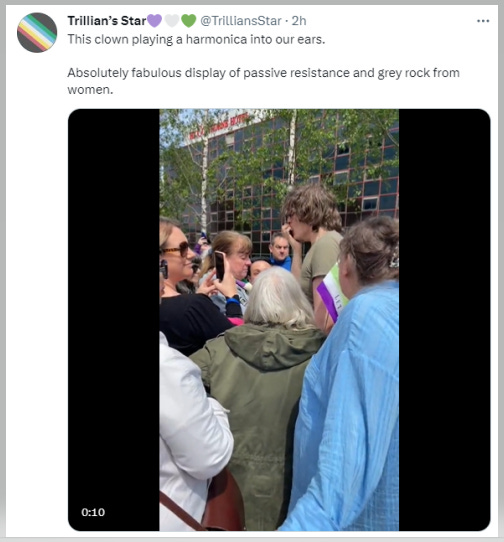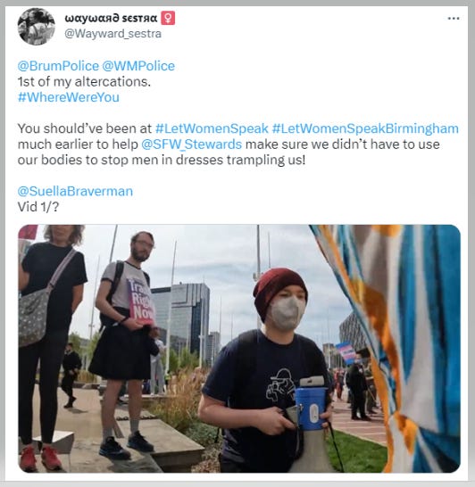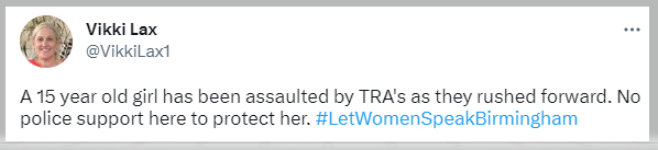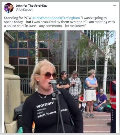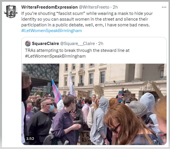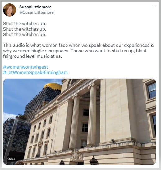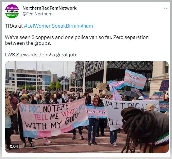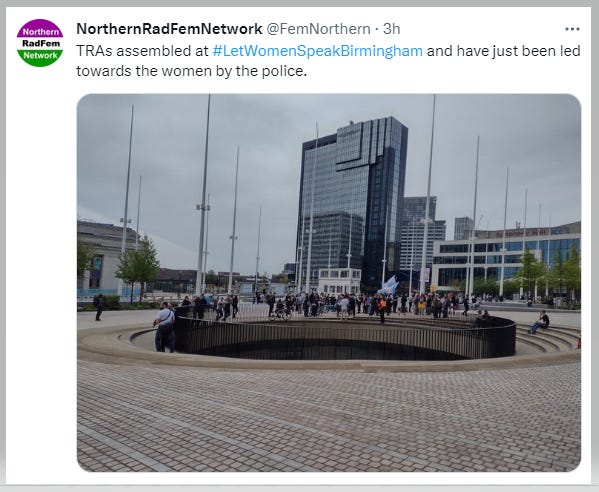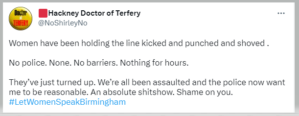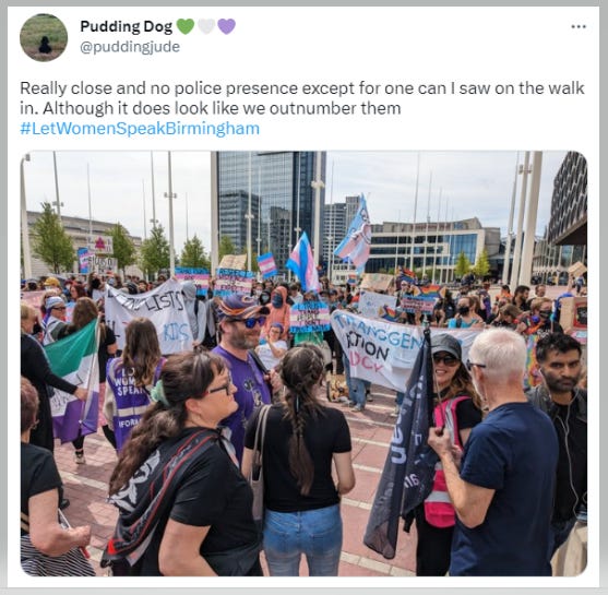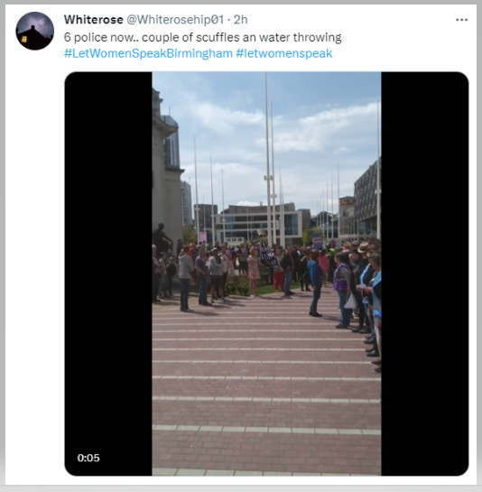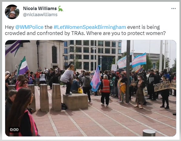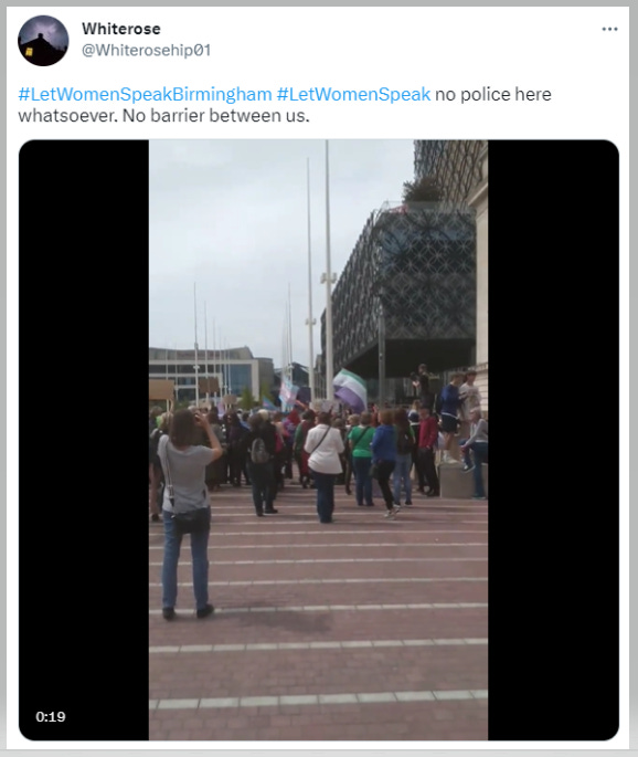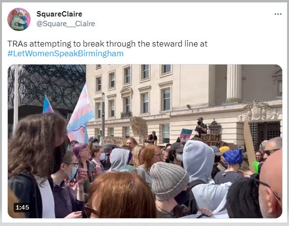 The Birmingham event was no exception, with trans activists mobbing the women trying to gather and speak. Their usual tactics - amplified music, noise, shouting, crowding, intimidation, chanting, insults, claxons etc - were much in evidence.