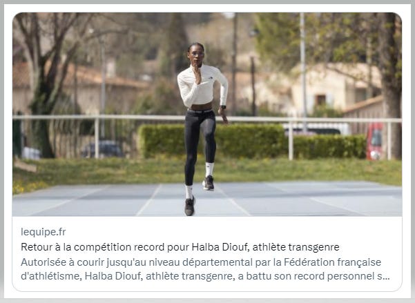 In March this year World Athletics barred transgender male athletes from competing in women’s competitions, citing the obvious ‘need to protect the female category’ for doing so. Until this ruling, French trans-identified male, Halba Diouf, had been enjoying considerable success in women’s events.