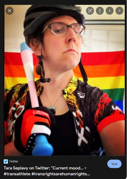 According to The Post Millennial, the aforementioned Tara (formerly Todd) Seplavy - the baseball bat wielding deputy editor of Bicycling Magazine - has engaged in a targeted harassment campaign against Inga Thompson over the last few years.