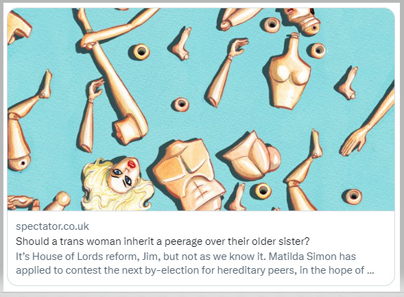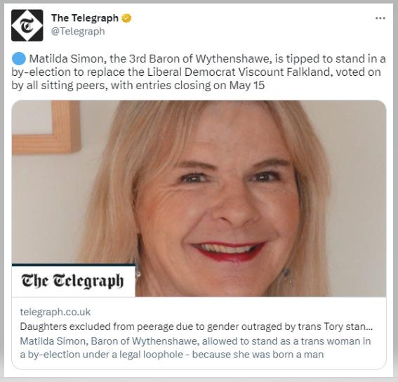 SUNDAY TELEGRAPH: A trans-identified male is hoping to take up a hereditary peerage which he’s only entitled to because he’s a man.