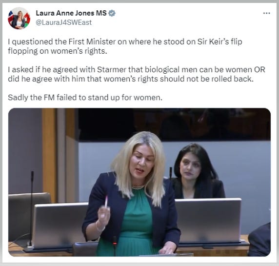 This week, at another FM’s Questions, Laura Anne Jones again questioned Drakeford about women’s rights, especially in light of Keir Starmer’s contradictory statements on Labour’s policies towards them.