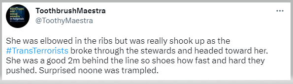 We know from previous experience that trans activists cannot allow women to assemble and discuss their sex-based rights and experiences in peace. They descend, en masse, to every SFW meeting and try to disrupt proceedings with noise and intimidation, their aggression often bubbling over into real violence.
