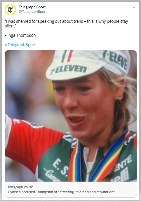 TELEGRAPH SPORT: US cycling legend, Inga Thompson, has been ‘shamed’ by the team on which she served as a board member over her defence of women’s sport.