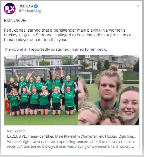 REDUXX: A women’s hockey team in Scotland includes a trans-identified male player who, it is alleged, injured a young girl on the pitch during a match.