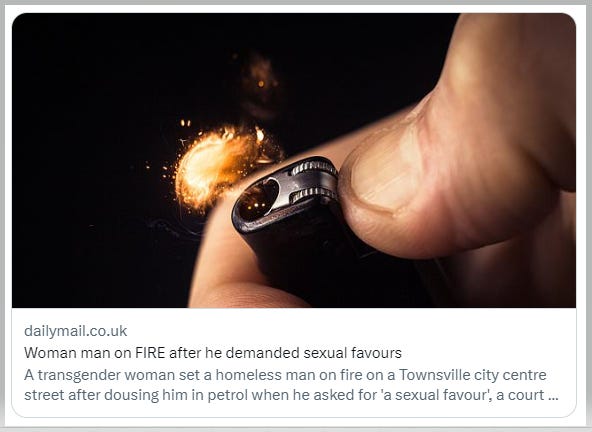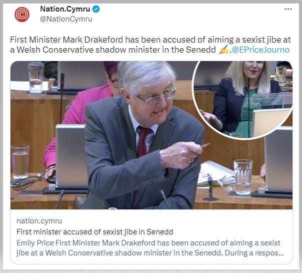 SMH, again. We must continue to mock these vile people and refuse to use their language. KJK has it right. Call them out, mock them, laugh at them and push back, hard. Where are the stories of the TIW creating havoc in men's spaces and men's sports? Can those blinded by the ideology not see that EVERY accommodation is being made for MEN? Women pretending to be men don't get a look-in. No media coverage for them, no beverage and makeup deals, no razor deals, no commercials for the US military..... Drakeford is a ridiculous, woman-hating fool. I wonder how many of these men in power secretly wear their wives' underwear? Could explain their doubling down on breaking down the doors to let men into women's spaces. Just saying..... Riley Gaines is giving me hope. Very good interview with her on Peterson's podcast. Also the sorority group in the USA suing their university. Girls don't like boys in their spaces ogling at them and stealing their trophies. Funny that. Also videos doing the rounds on YT of school girls challenging boys in their toilets. I don't feel as depressed as I usually do after this missive!