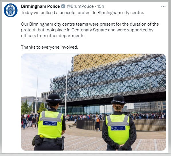 Birmingham Police have claimed that they were present throughout the event and that it was ‘peaceful’.