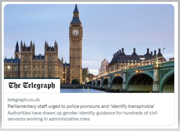 The Telegraph has learned that hundreds of civil servants who work in Westminster have been provided with ‘guidance’ about gender identity. The 15-page pamphlet, seen by the paper, undermines the Equality Act 2010, pressurises parliamentary staff into adherence to gender identity dogma and compromises female-only spaces. Unsurprisingly, it links to the websites of Gendered Intelligence and Stonewall with the latter described as ‘our expert partners’. It has been in circulation internally for the last three years.