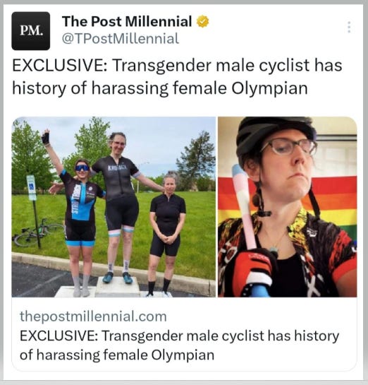 In other sporting news this week, a 48-year-old trans-identified male, Tara (formerly Todd) Seplavy, beat 15-year-old Maya Brothers by 12 seconds to steal first place in the women’s 3/4/5 race at the Emrick Blvd Crit in Pennsylvania.