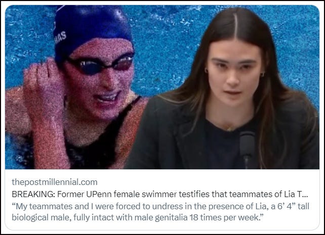 “What you do not know”, Scanlan told the committee, “Is the experiences of the women on the University of Pennsylvania swim team. My teammates and I were forced to undress in the presence of Lia, a 6' 4" tall biological male, fully intact with male genitalia 18 times per week”.