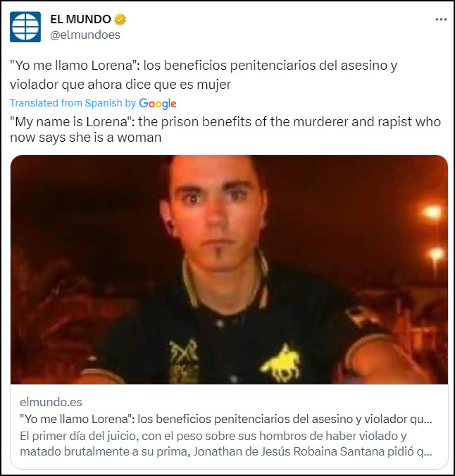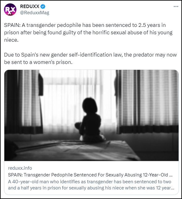 Her abuser was sentenced to two and a half years imprisonment. Of course, he now ‘identifies as a woman’ and, thanks to Spain’s ‘trans law’ self-ID legislation, could be incarcerated in a female prison.