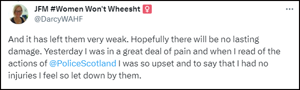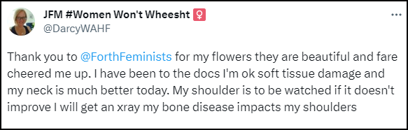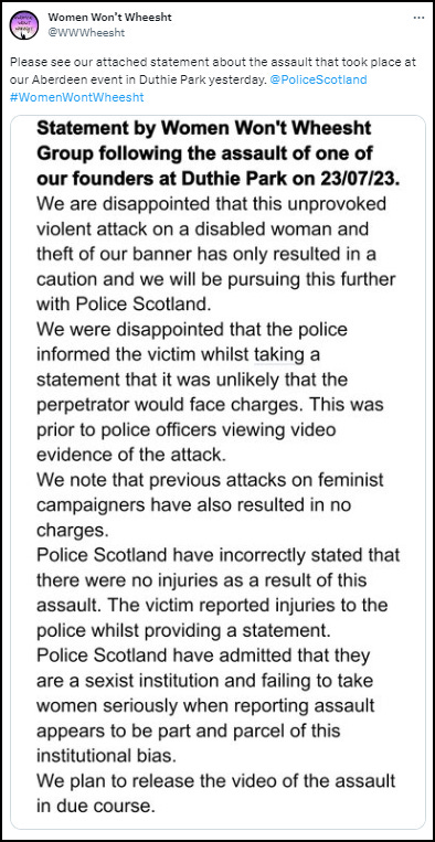 Women Won’t Wheesht issued a statement over Police Scotland’s decision not to take action. “We are disappointed that this unprovoked violent attack on a disabled woman and theft of our banner has only resulted in a caution and will be pursuing this further with Police Scotland. We were disappointed that the police informed the victim whilst taking a statement that it was unlikely that the perpetrator would face charges.”