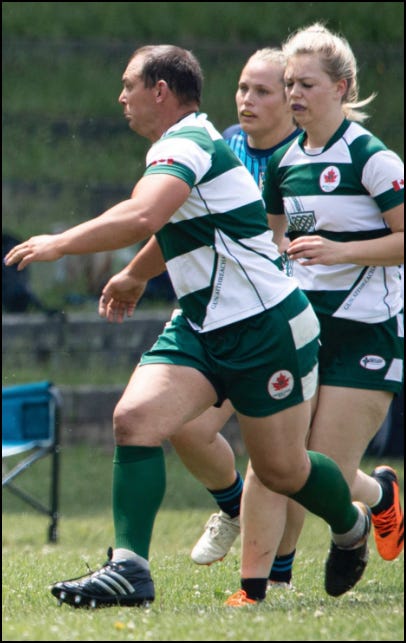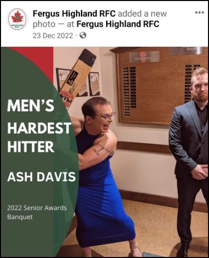 Despite being quite obviously male, Ash Davis claims to identify as ‘non binary’. He plays for the Fergus Highland women’s rugby team in Ontario.