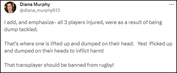 Davis’ inclusion has certainly proved to be dangerous to his female oppononents. In a recent game against the Stoney Creek women’s team, he is alleged to have injured three female players with a ‘dump tackle’ (where the player is deliberately lifted from their feet and thrown to the ground). Diana Murphy, a friend of some of the players involved, tweeted about the game.