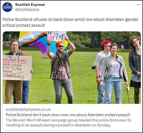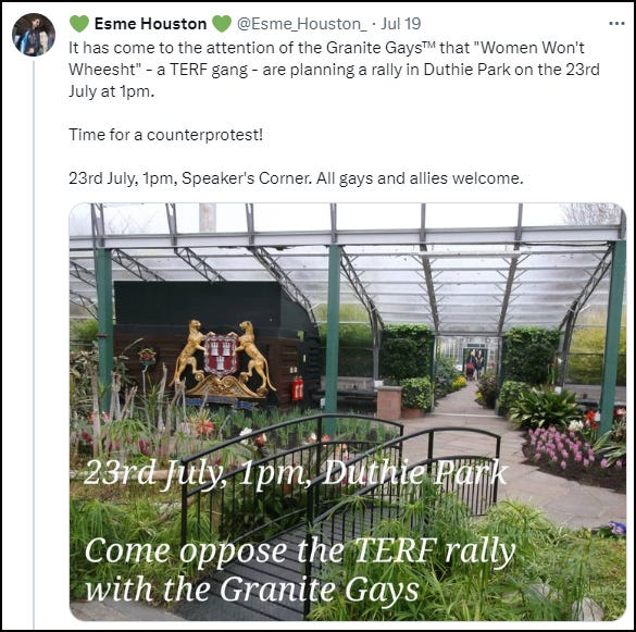 Trans-identified male, Esme Houston, instigated the protest against the Aberdeen event at which women were exercising their perfectly legal right to public assembly.