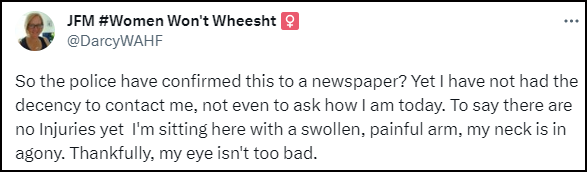 Last week we reported on a Women Won’t Wheesht event being held in Aberdeen. A 54-year old disabled woman, Julie Marshall, was seriously assaulted by a young male trans rights activist there.