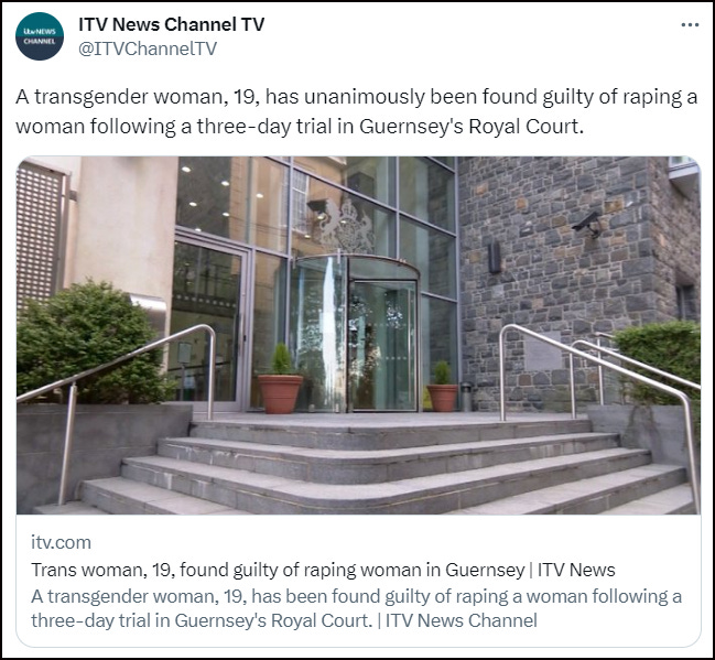ITV NEWS: A trans-identified male has been found guilty of raping a young woman on the island of Guernsey.