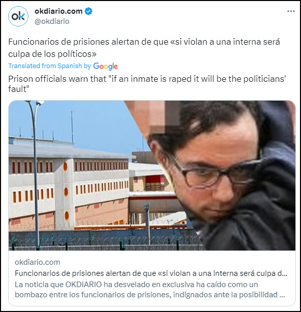 This week Okdiario reported that Robaina Santana, now taking cross-sex hormones, has requested a transfer to a women’s prison. Vanessa’s mother, Sonia Padilla, told El Mundo, “It's all a show. If he goes to a women's prison, it will be like putting a wolf in a sheep pen”.