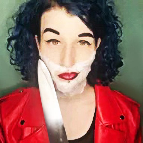 And here’s the author of the AV Club piece, a trans-identified male, doing some cosplay with a knife.