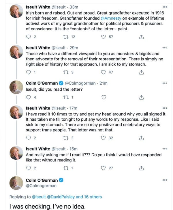 Amnesty Ireland’s Colm O’Gorman has been on the back foot since he ‘proudly’ signed the letter and it’s telling that the only support he’s getting is from David paisley, who mocks and harasses women and then tries to cover up the evidence. (Here’s the podcast version of the video he successfully got YouTube to remove).
