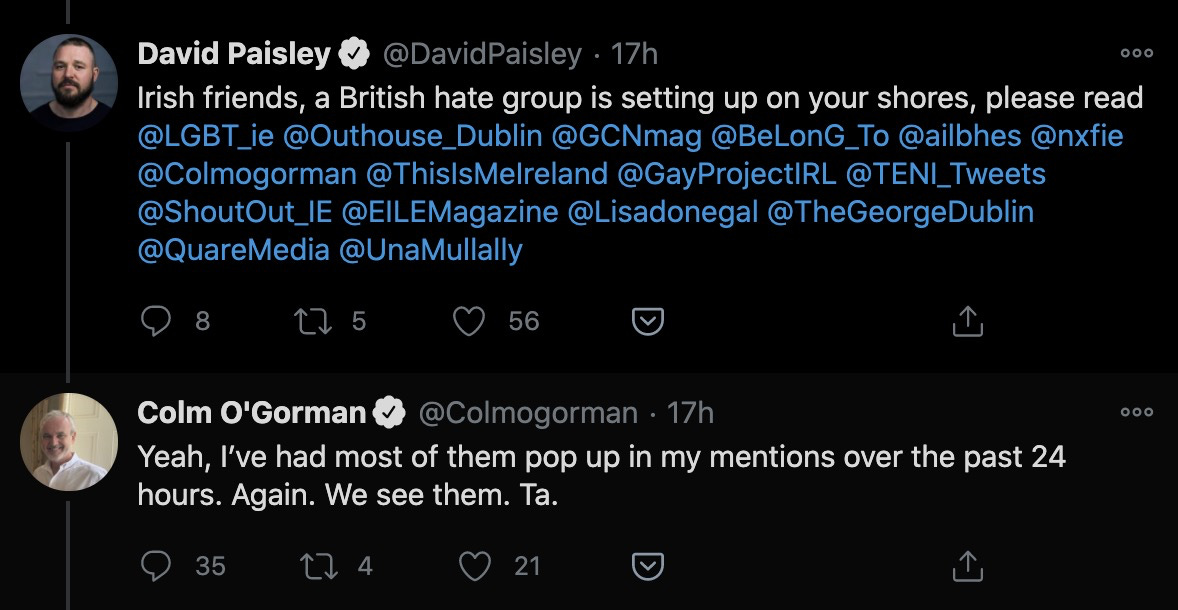I see that Colm is saying that the groups are on the "far right". Drives me nuts that TRAs think that gender ideology is left wing. Left wing is about fighting to get people equal access to food, housing, education. Trans ideology is liberal and is nothing as useful as any of those things. Pronouns and calling a man a woman are not useful. Saying that people fighting for sex based rights are right wing is just more divisive nonsense designed to shut people up