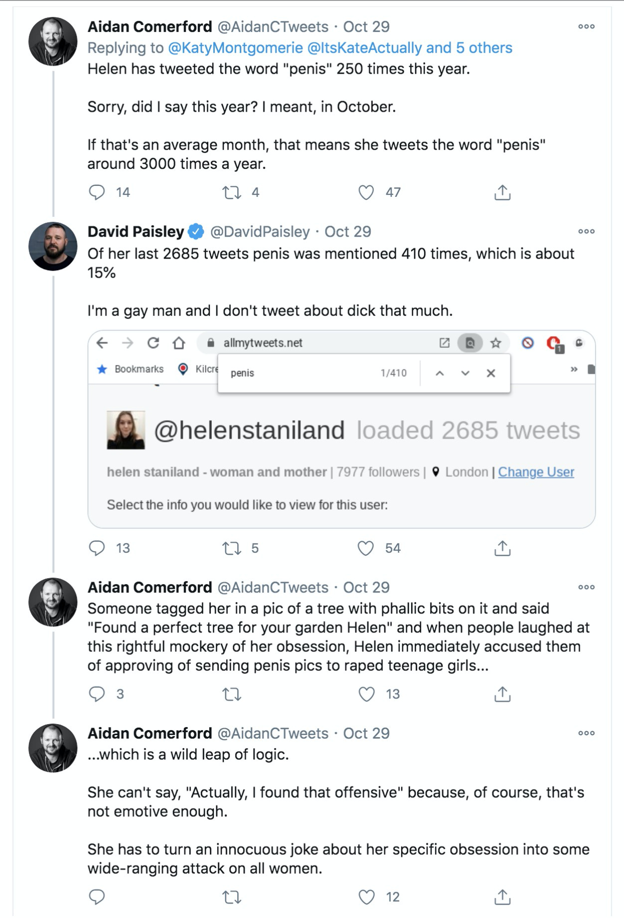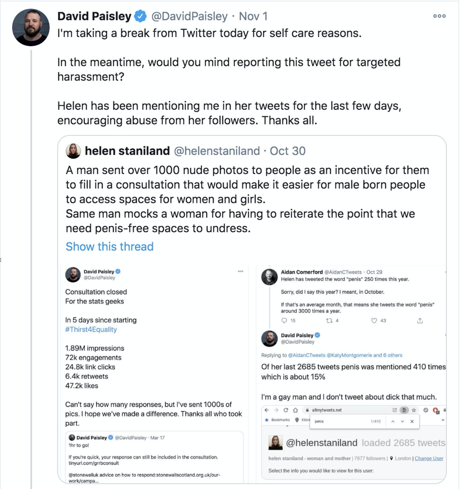 As you can see, the question is designed to make it clear what men are actually asking when they demand that trans-identified males have access to female spaces. Its power is in its simplicity. To us gender-critical types, the answer is very simple: No. But to men like David Paisley, the answer is so complicated that he would rather Helen stops asking it altogether. To that end, he’s doing everything he can to silence her voice.
