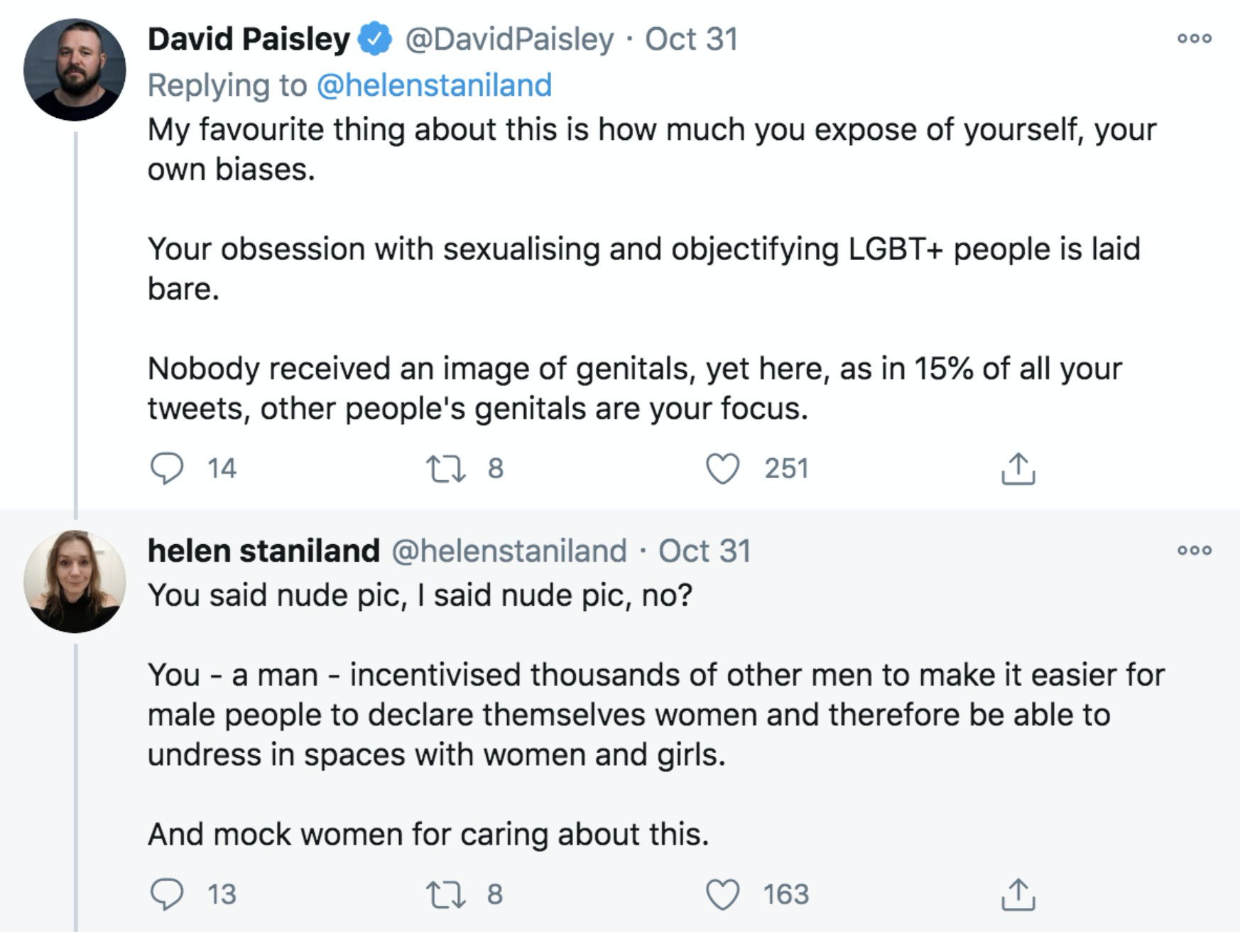 …and despite Helen pointing out that she said nothing about genitals, he misrepresented her argument to his followers. Again, pure DARVO tactics.
