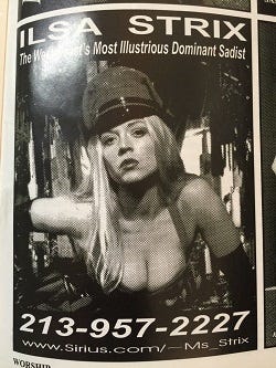 Ilsa arrived in Los Angeles around 1997, having risen through the bondage communities of San Francisco and New York. “I started playing with BDSM from my very first intimate relationships, just after high school,” she said in a 2001 interview with the BDSM Web site DickieVirgin.com. “It took me until my early twenties to understand that sadomasochism was an integral part of who I was, and define myself as part of the leather community.” In a 1996 interview, Ilsa described one particular client: “I wrestle [with him]. We enact scenes from Hong Kong videos where women throw men around.”