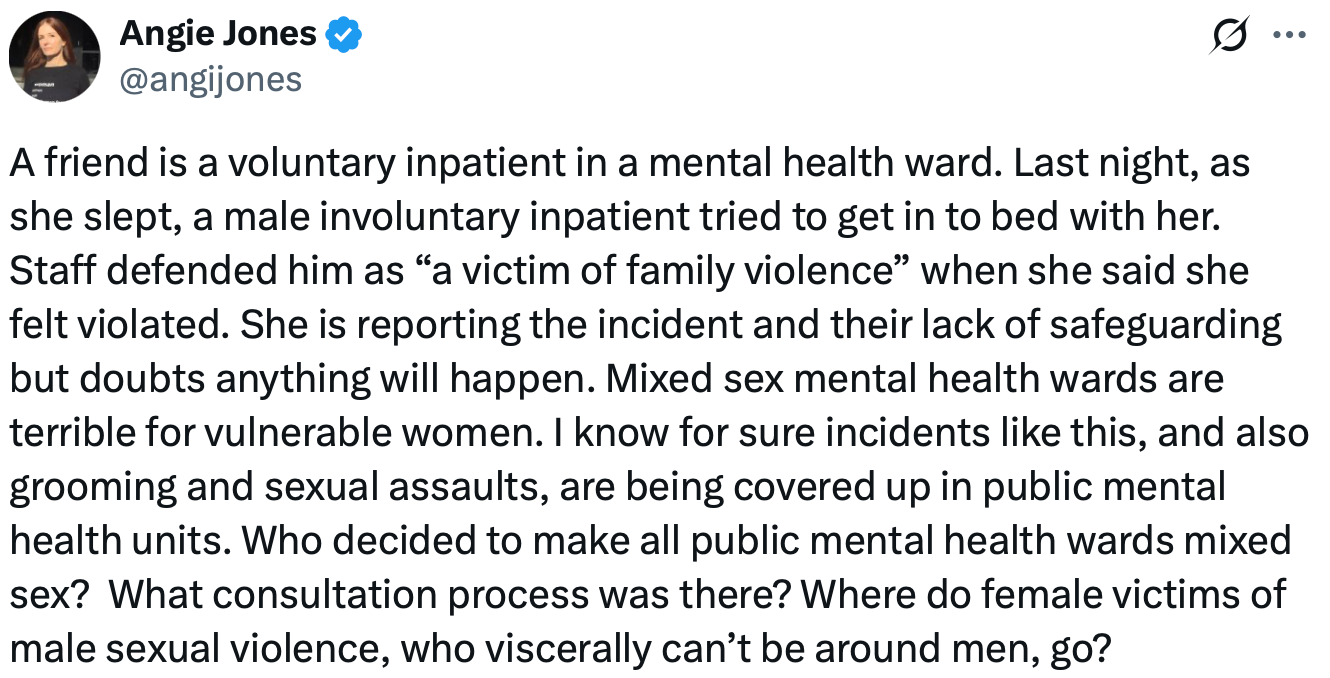 Angie Jones, a Victorian women’s rights activist posted on X about what this means for vulnerable women in public psychiatric hospitals: