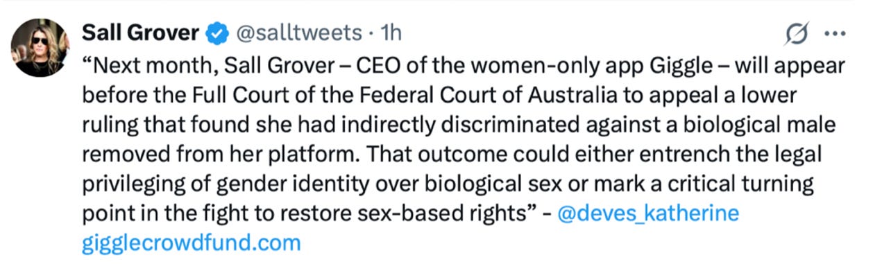 The Giggle appeal in August aims to reverse the legal fiction pushed by LGBTQi+ lobby groups, politicians, men like Judge Bromwich and women like Julia Gillard that ‘trans women are women.’ They are not.