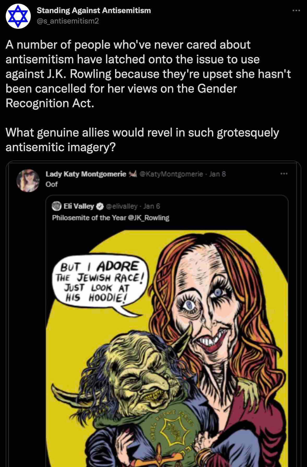 Eli is Jewish but believes in gendered souls so he’s happy to smear Rowling in this way. ‘Katy’ knows it’s a lie but likes spreading it anyway because he’s a malicious bully.